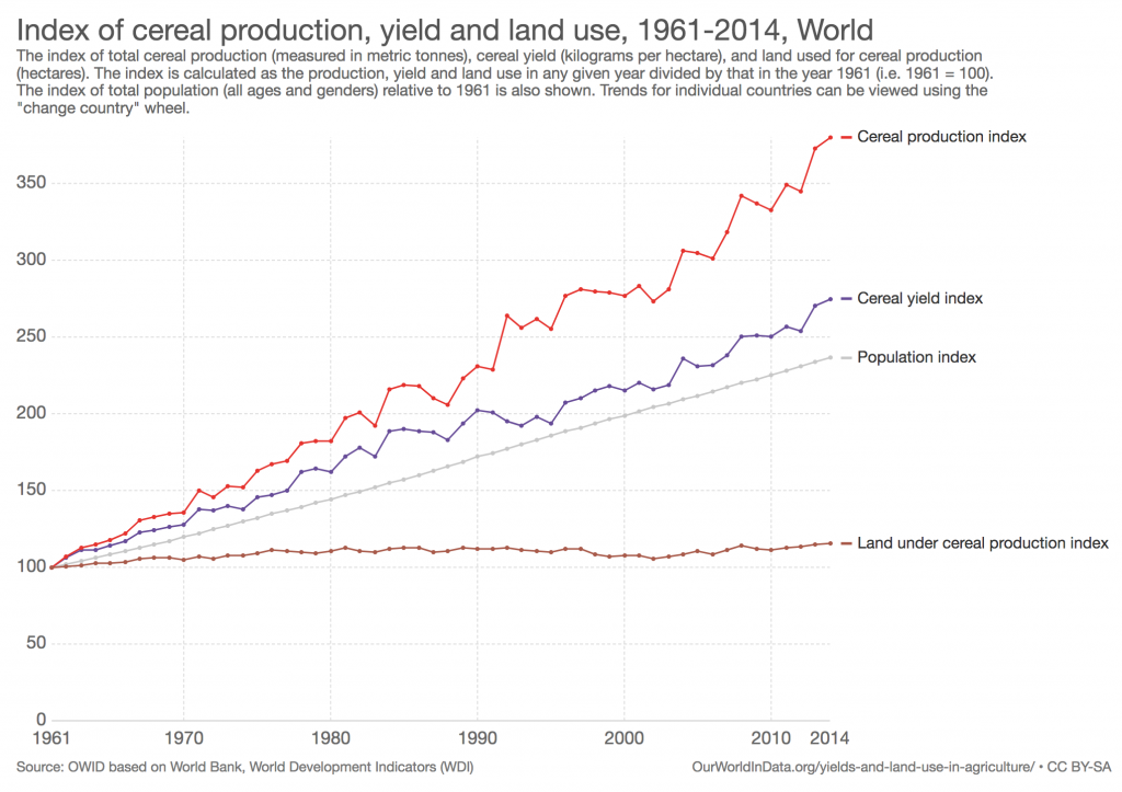 In der folgenden Grafik aus www.ourworldindata.org ist der Zusammenhang zwischen Bevölkerungswachstum, Getreideertrag und dazu benötigtem Landverbrauch zwischen 1961 und 2014 global visualisiert: