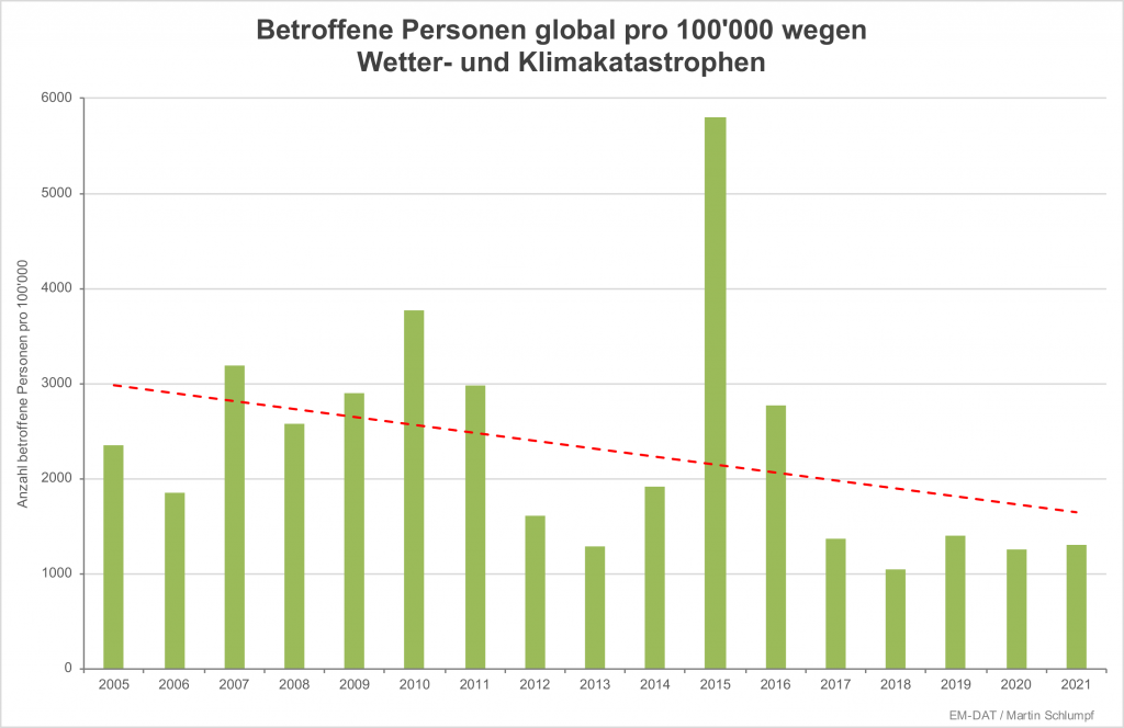 Auch hier sind die Zahlen pro 100’000 Personen der Weltbevölkerung umgerechnet. Und da zeigt sich ebenfalls eine klarer Abnahme um insgesamt 46 Prozent. Wiederum gibt es Ausreisser, wie im Jahr 2015, in dem wegen einer Dürre in Indien mehr als 300 Millionen Menschen betroffen waren, das sind vier Fünftel der Gesamtzahl dieses Jahres. Aktuell gab es im Jahr 2021 100 Millionen von Naturereignissen betroffene Menschen, das sind 1,3 Prozent der Weltbevölkerung.