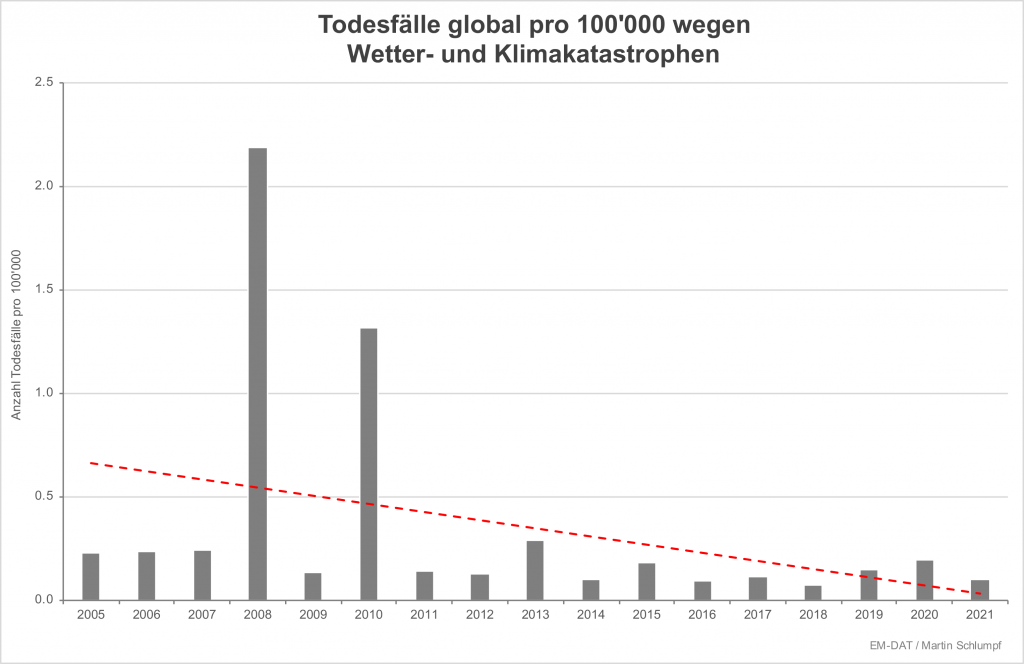 Vor allem aber sehen wir, dass die rot-gestrichelte Trendlinie (Regressionsgerade) eine klar sinkende Tendenz aufweist. Dies ist umso erstaunlicher, als bereits die hundert Jahre zuvor insgesamt eine Abnahme des Todesrisikos um 96 Prozent gezeigt haben (siehe hier). Die Gefahr, heute wegen einer Naturkatastrophe sterben zu müssen, ist also verschwindend klein: Im Jahr 2021 starben weltweit knapp 8000 Menschen, das sind 0,1 auf 100’000 oder einer aus einer Million.