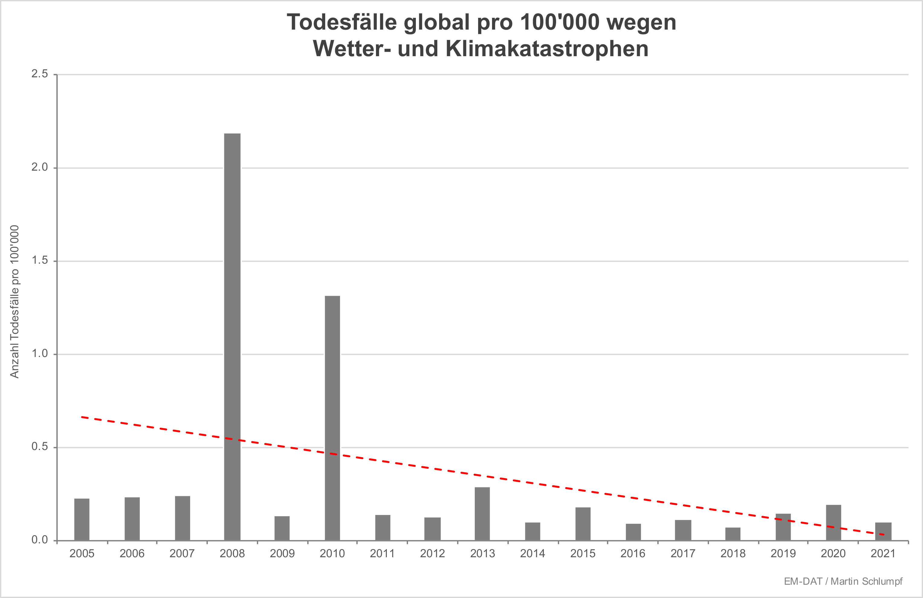 Vor allem aber sehen wir, dass die rot-gestrichelte Trendlinie (Regressionsgerade) eine klar sinkende Tendenz aufweist. Dies ist umso erstaunlicher, als bereits die hundert Jahre zuvor insgesamt eine Abnahme des Todesrisikos um 96 Prozent gezeigt haben (siehe hier). Die Gefahr, heute wegen einer Naturkatastrophe sterben zu müssen, ist also verschwindend klein: Im Jahr 2021 starben weltweit knapp 8000 Menschen, das sind 0,1 auf 100’000 oder einer aus einer Million.