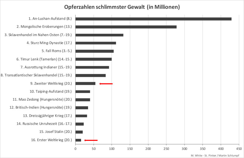 Dem hält Pinker eine Liste der «schlimmsten Dinge, die Menschen einander angetan haben» entgegen. Eine Liste, die vom amerikanischen Bibliothekar Matthew White 2010 zusammengestellt wurde (siehe hier). White hat aus einer Vielzahl historischer Schriften und Enzyklopädien eine Rangliste «menschlicher Abscheulichkeiten» erstellt, bei der er nicht nur die Opfer auf dem Schlachtfeld, sondern auch Todesfälle unter Zivilisten berücksichtigt hat, die indirekt durch Hunger und Krankheiten verursacht wurden.