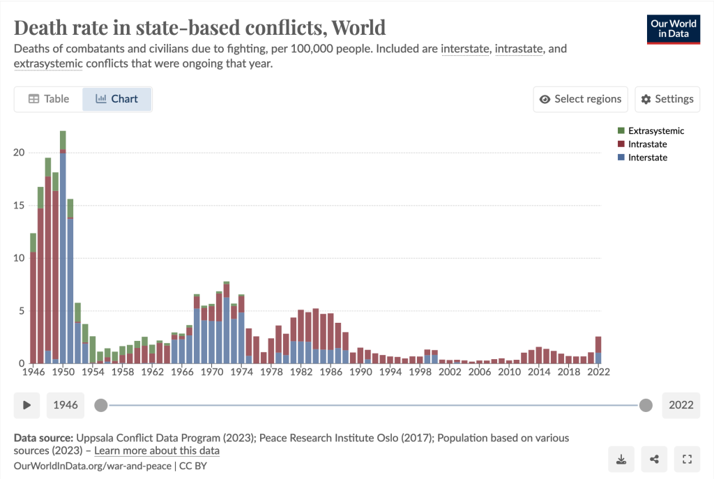 Weil aber auch diese Daten – je weiter zurück sie reichen – immer noch lückenhaft sind, werfen wir noch einen genaueren Blick auf die Zeit nach dem Zweiten Weltkrieg – der Zeit, der Steven Pinker den Namen «Der lange Frieden» gegeben hat. Die entsprechende Grafik für die Zeit von 1946 bis 2022 stammt wiederum von «Our World in Data» (siehe hier):