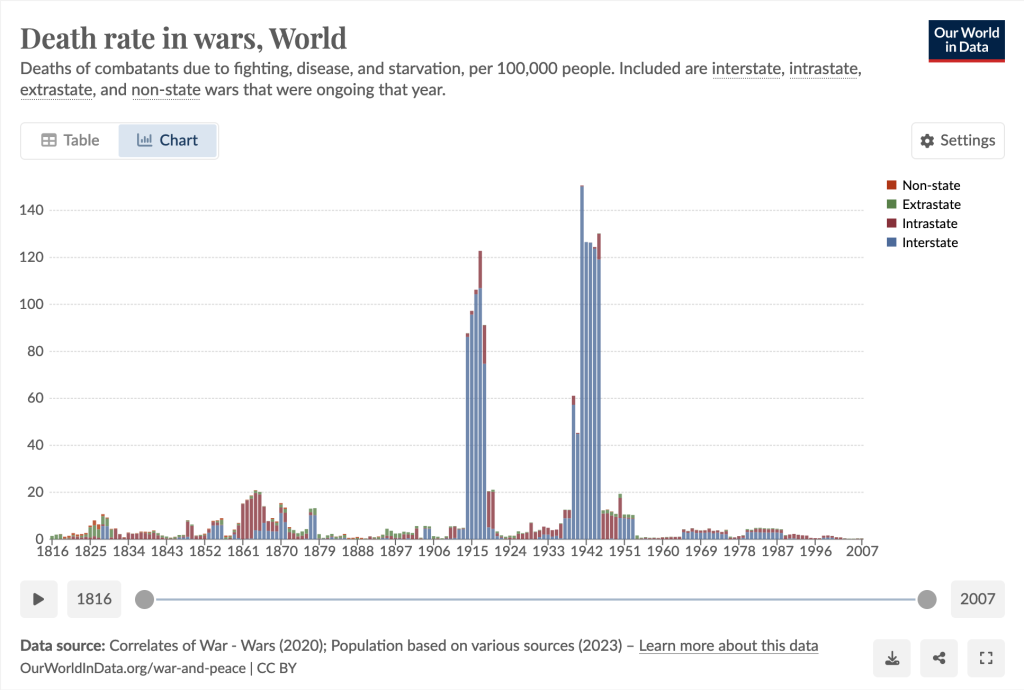 Verlassen wir nun aber dieses spekulative Feld und betrachten wir die besten heute zur Verfügung stehenden Quellen über Kriegsopfer. Diese finden sich auf der Webseite «Our World in Data», und zwar vor allem im Übersichtsbeitrag «War and Peace» (siehe hier). Im Folgenden zeige ich daraus zuerst die Entwicklung der Kriegsopferzahlen in den letzten 200 Jahren. Dabei verwende ich die sogenannten Todesraten, mit denen die Zahl der Opfer pro 100’000 Menschen angegeben wird – die Bevölkerungsentwicklung wird so berücksichtigt.