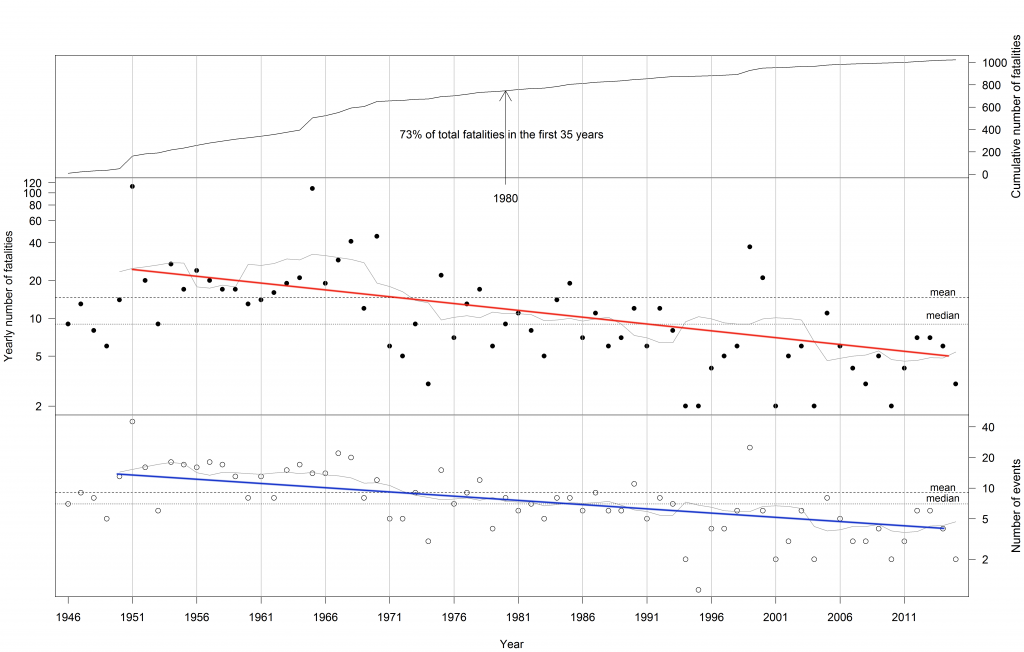 Die oben abgebildete Grafik stammt aus dieser Studie. Im mittleren Teil sind die Todesfälle pro Jahr seit 1946 aufgezeichnet. Im gesamten 70-jährigen Zeitraum ergibt sich ein Total von 1’023 Opfern, was einem Durchschnitt von 15 pro Jahr entspricht. Verglichen mit sämtlichen Todesfällen aller Ursachen ist das ein Anteil von 0.025 Prozent, oder zwei bis drei aus 10’000 Toten. Die Gefahr, wegen solchen Naturprozessen zu Tode zu kommen, ist verschwindend klein.