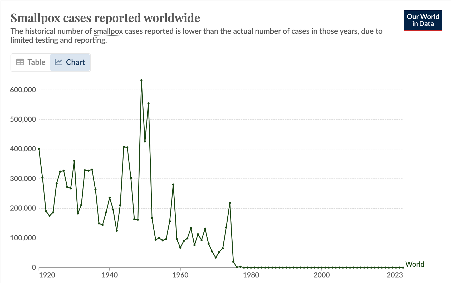 Die hier gezeigten Zahlen sind mit Sicherheit viel zu niedrig, weil es bis in die 1970-er Jahre keine internationale Organisation gab, die lokale Krankheits-Meldungen verifizieren konnte. Experten schätzen, dass die realen Zahlen um den Faktor 50 bis 100 grösser sein könnten. Die Grafik zeigt jedoch, dass die Bemühungen um die Ausrottung der Pocken eine langfristig erfolgreiche Geschichte ist, die aber immer wieder durch empfindliche Rückschläge gefährdet war.