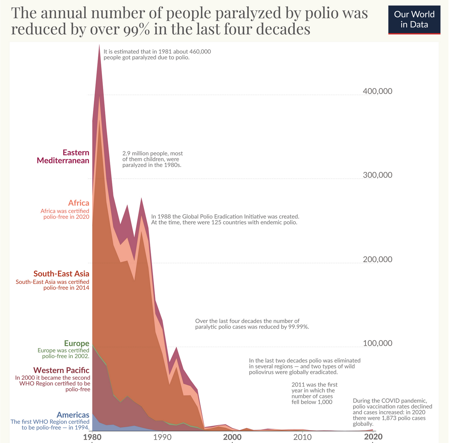 Der Höchststand der Opferzahlen betrug also 460’000 pro Jahr, das Minimum lag unter 1000. Damit konnte die Zahl der Menschen, die von Polio betroffen sind (in erster Linie Kinder), in den letzten vierzig Jahren um über 99 Prozent gesenkt werden. Dabei zeigt die Grafik, dass als erste Region Nord- und Südamerika 1994 poliofrei wurden. Der gleiche Durchbruch gelang im Jahr 2000 im westlichen Pazifik. In Europa war es 2002 so weit, in Südostasien 2014 und in Afrika 2020. In diesem letzten betrachteten Jahr gab es Kinderlähmung nur noch in Pakistan und Afghanistan.