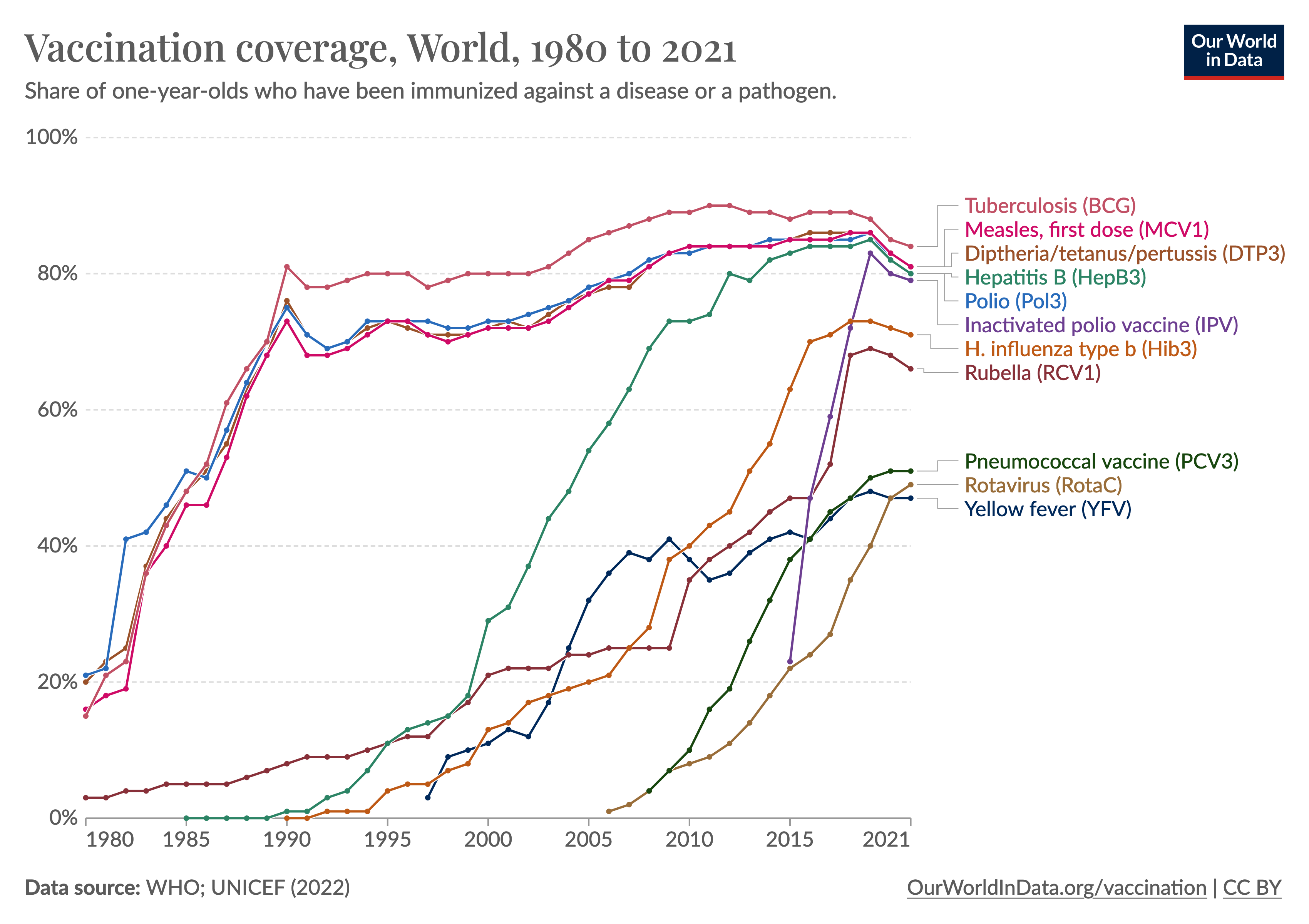 In der nächsten Grafik sehen wir die Durchimpfungsrate einjähriger Kinder bei den wichtigsten ansteckenden Krankheiten. Die Prozentzahlen geben den weltweiten Stand von 1980 bis 2021 wieder (auch diese Grafik stammt von «Our World in Data», siehe hier).