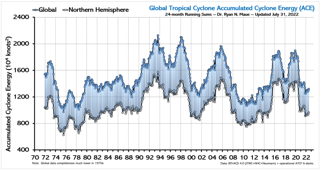 Ist aber bei den Stürme ein Trend zu erkennen? Immerhin verursachen diese global gesehen am meisten Opfer und Schäden. In der erwähnten Studie wird folgende Grafik diskutiert, die von der Website «Global Tropical Cyclone Activity» von Ryan N. Maue stammt (siehe hier):