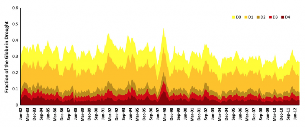 Ein ähnliches Bild zeigt sich auch bei Überschwemmungen und Dürren. Die folgende Grafik aus der erwähnten Studie zeigt den Flächenanteil der Welt, der von 1982 bis 2012 gemäss verschiedener Kriterien von einer Dürre betroffen war. Die Studie bezieht sich dabei auf eine Arbeit von Zengchao Hao et al. von 2014 (siehe hier).
