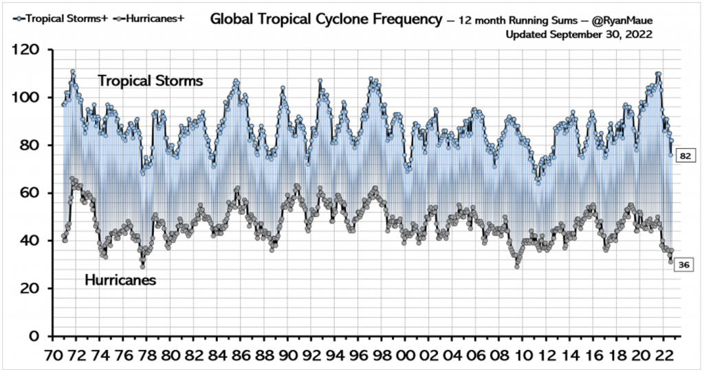 Die obere hellblaue Kurve zeigt die globale Zahl aller tropischen Wirbelstürme seit 1970, während in der unteren grauen Kurve die spezifische Zahl aller Hurrikane angegeben ist. Hurrikane sind besonders starke Wirbelstürme, die eine bestimmte Windgeschwindigkeit überschreiten und deshalb oft verheerende Folgen haben. Offensichtlich ist bei den beiden Kurven kein Trend erkennbar. Die Zahlen schwanken allerdings ziemlich stark – was Tür und Tor für Alarmismus öffnet: Zum Beispiel könnte der Anstieg der oberen Kurve von 2020 bis Ende 2021 eine Negativschlagzeile hergeben – obwohl gleichzeitig die Zahl der Hurrikane leicht abnimmt.