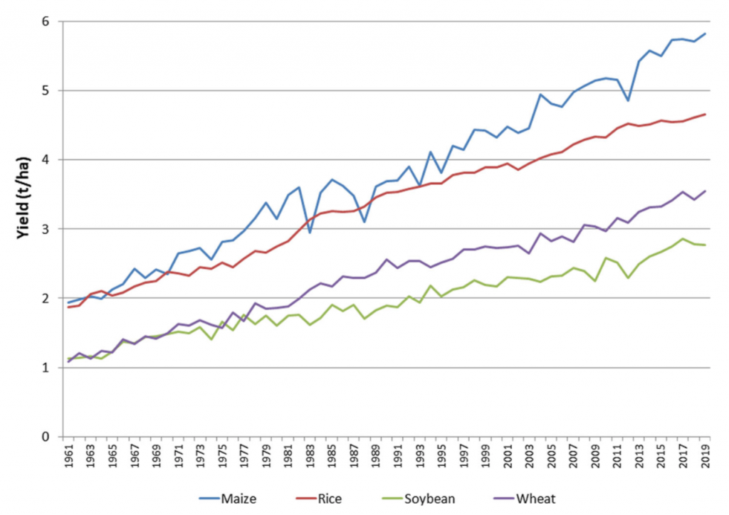 Die Forscher haben den Ertrag in Tonnen pro Hektare für Mais (hellblau), Reis (braunrot), Weizen (violett) und Soja (hellgrün) für die Zeit von 1961 bis 2019 untersucht. Dabei haben sie für alle vier Nahrungsmittel, die zusammen für 64 Prozent der menschlichen Kalorienzufuhr verantwortlich sind, einen positiven linearen Trend gefunden. Die Mengen steigen um 2.4 und 3.8 Prozent pro Jahr. Als Treiber für diese positive Entwicklung bezeichnen die Autoren die CO2-Düngung und den technologischen Fortschritt, der sich insbesondere in der Entwicklung neuer Gentech-Arten und in verbesserten Anbaumethoden zeigt.