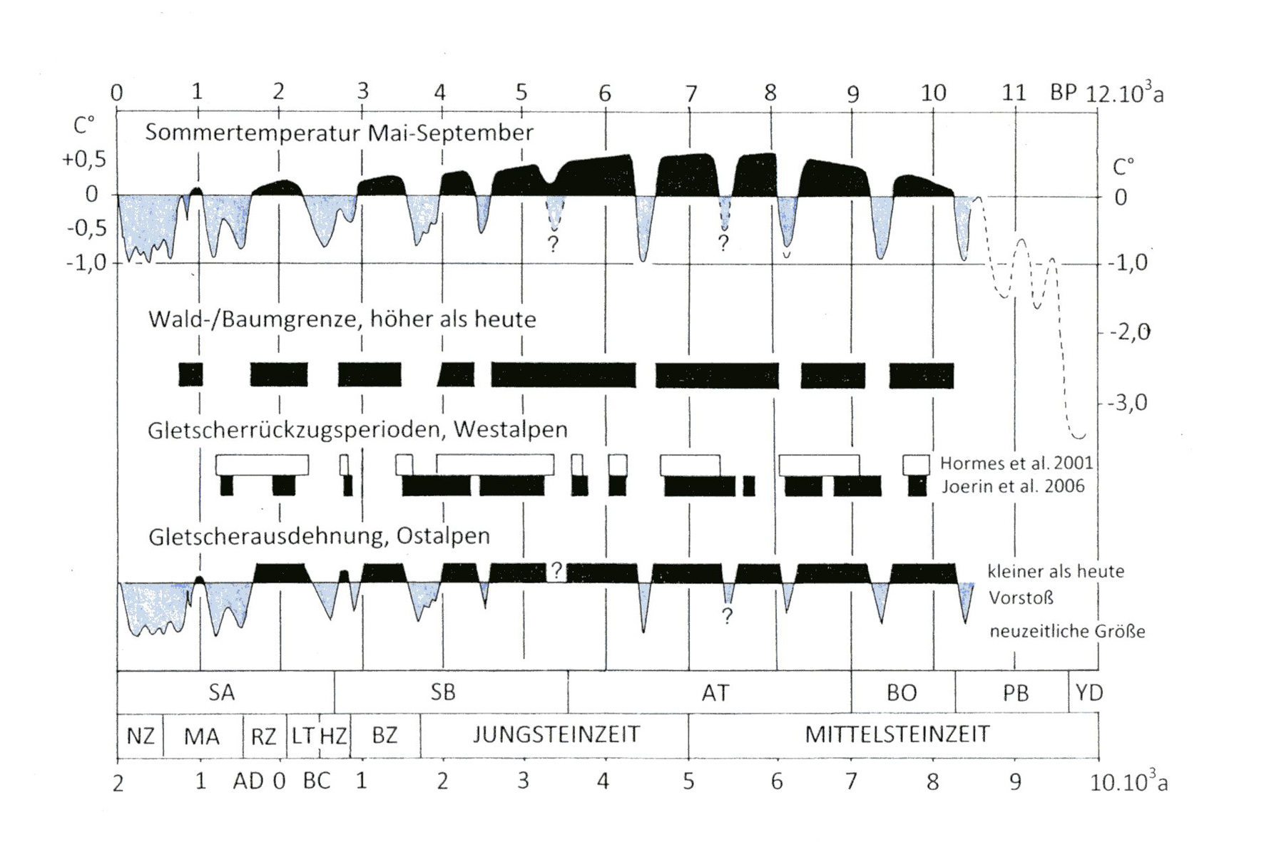 Aus der Analyse 143 solcher Fundobjekte haben Forscher der Universität Bern zwölf Perioden errechnet, in denen die Gletscher kürzer gewesen sind als heute. Diese Perioden sind in der zweituntersten Zeile der Grafik mit schwarzen Balken eingetragen. Es sind die Resultate aus der Studie «Joerin et al.», die 2016 erschienen ist (siehe hier). Daran mitgearbeitet hat auch der emeritierte Berner Geologie-Professor Christian Schlüchter, der als erster solche Gletscherfundstücke gesammelt und auch das Vorwort zum Buch von Gernot Patzelt verfasst hat.