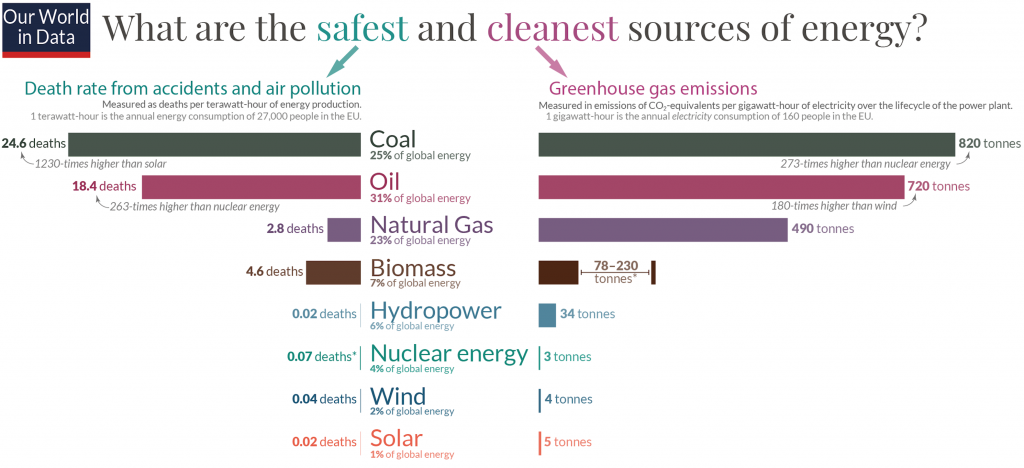 Die hier verwendete Grafik zeigt aber eindrücklich, wie die drei fossilen Träger im Gesamtbild um mehrere Grössenordnungen schlechter abschneiden, als die Erneuerbaren und die Kernenergie. Gemäss dem Titel der Grafik sind also Wasser, Kernenergie, Wind und Solar die sichersten und saubersten Stromquellen. Gut lässt sich zudem herauslesen, wie sehr sich Erdgas unter den Fossilen vor allem von der Kohle positiv absetzt.