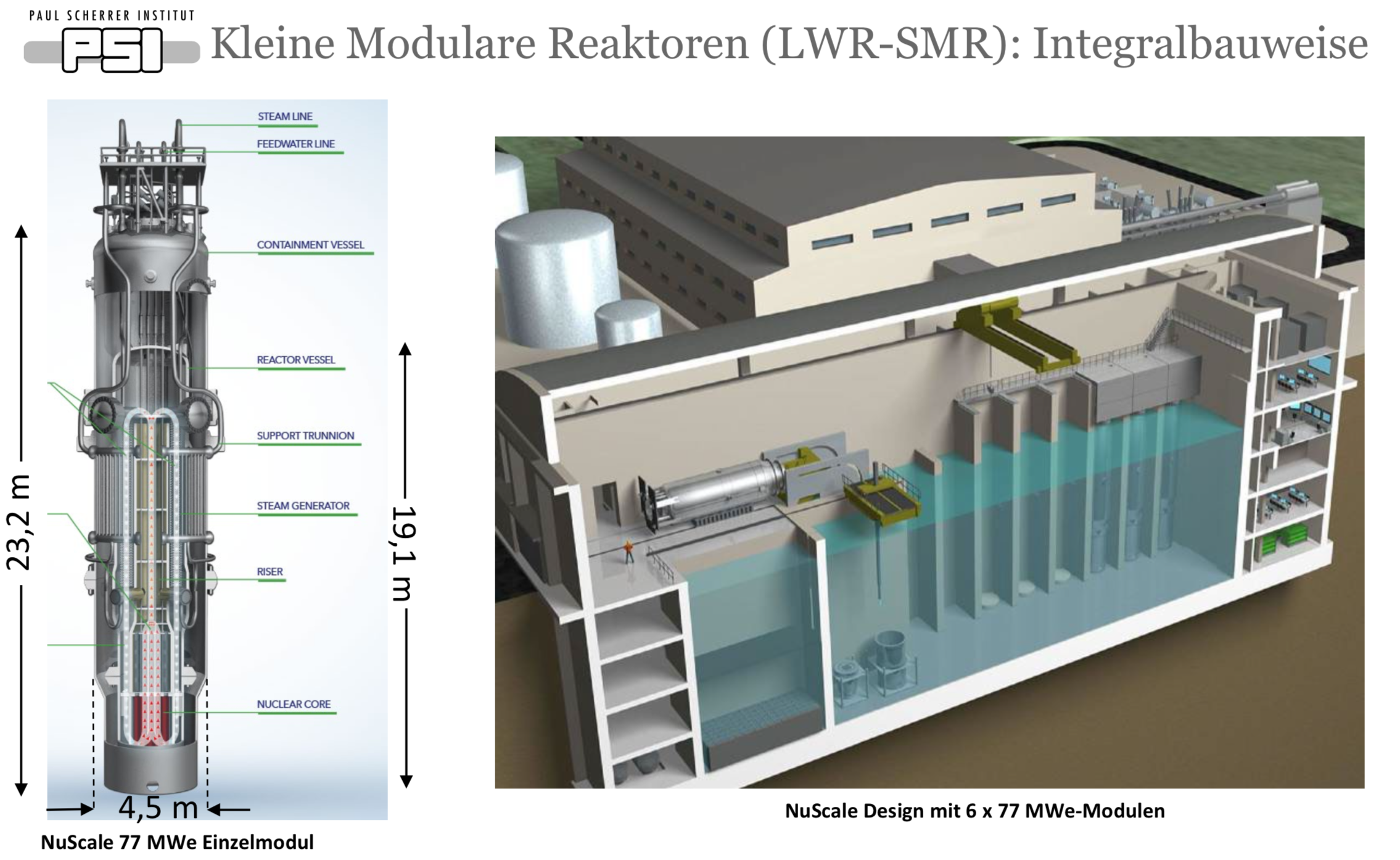 Links ist ein Einzelmodul mit doppeltem Containment mit 77 MW elektrischer Leistung abgebildet. Rechts sieht man ein wassergeflutetes unterirdisches Sicherheitsgebäude, das bis zu sechs dieser Module aufnehmen kann. Nach neuesten Angaben sollen sogar bis zu zwölf Modulen eingebaut werden können. Jedes einzelne dieser Module kann individuell gesteuert und für verschiedene Anwendungen zum Einsatz gebracht werden. Damit wird dieser Reaktor zu einem sehr flexibel einsetzbaren Energie-Erzeuger, der auch im Zusammenspiel mit den neuen Erneuerbaren bestens funktioniert. Selbstverständlich sind alle kritischen Komponenten auf vollständig passive Sicherheit ausgerichtet.