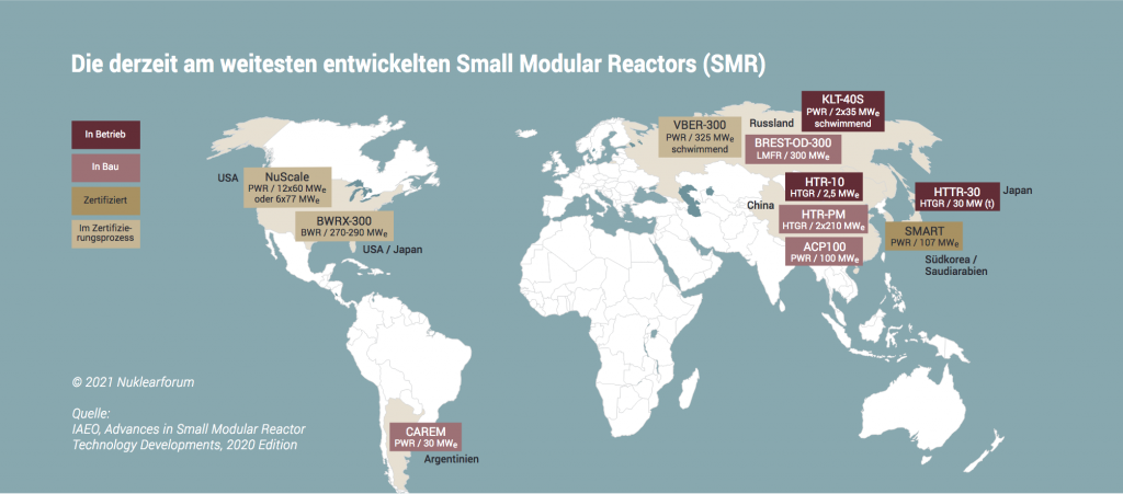 Wie man sieht, gibt es erst drei sehr kleine Reaktoren, die in Betrieb sind (über den Betriebszustand gibt die Legende links Auskunft): Die zwei KLT-40S im schwimmenden russischen Kernkraftwerk «Akademik Lomonosow», sowie zwei gasgekühlte Hochtemperaturreaktoren: der chinesische Minireaktor HTR-10 und der japanische Testreaktor HTTR-30. Diese Anlage, die nach der Fukushima-Katastrophe für mehrere Jahre stillgelegt worden war, ist seit Ende Juli 2021 wieder in Betrieb und hat im Januar 2022 einen wichtigen Test bestanden.