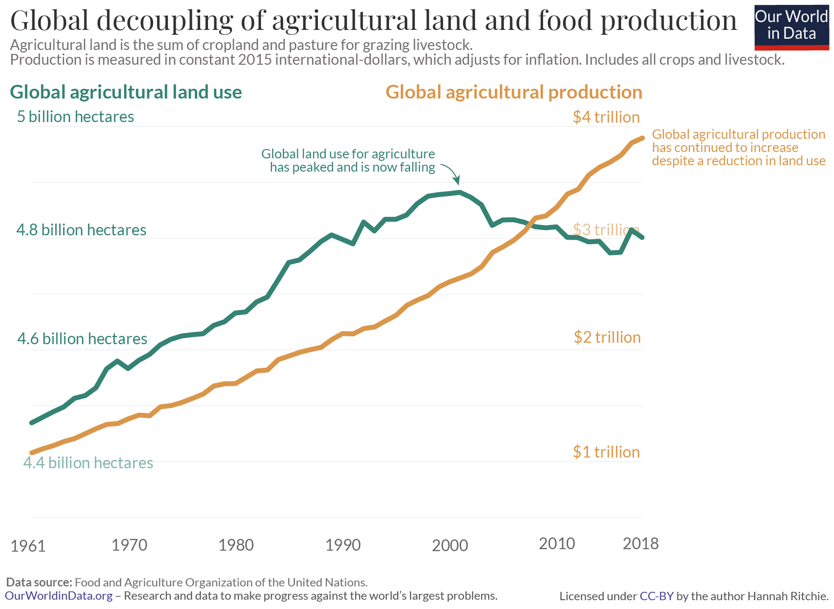 In engem Zusammenhang damit steht das hier gezeigte Dach der Kurven am rechten Rand der Grafik: Im Jahr 2000 erreichte die globale Landwirtschaftsfläche ihre maximale Ausdehnung. Nach den Daten der UN-Ernährungs- und Landwirtschaftsorganisation (FAO) lag die Bodennutzung bei diesem «Peak» knapp unter fünf Milliarden Hektaren. Das entspricht fast der Hälfte des gesamten fruchtbaren Landes der Erde.