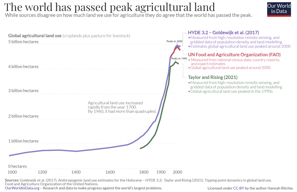 Die folgende Grafik von «Our World in Data» zeigt die Entwicklung der globalen Landwirtschaftsfläche in den letzten tausend Jahren (siehe hier).