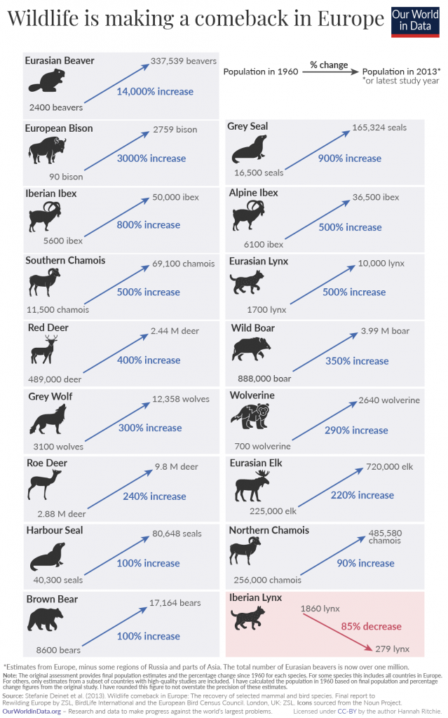 Die Grafik zeigt die Entwicklung der Bestände von 17 Wildtieren im Europa zwischen 1960 und 2013: Ausser dem Iberischen Luchs verzeichnen alle eine Zunahme zwischen 90 und sagenhaften 14’000 Prozent (siehe hier).