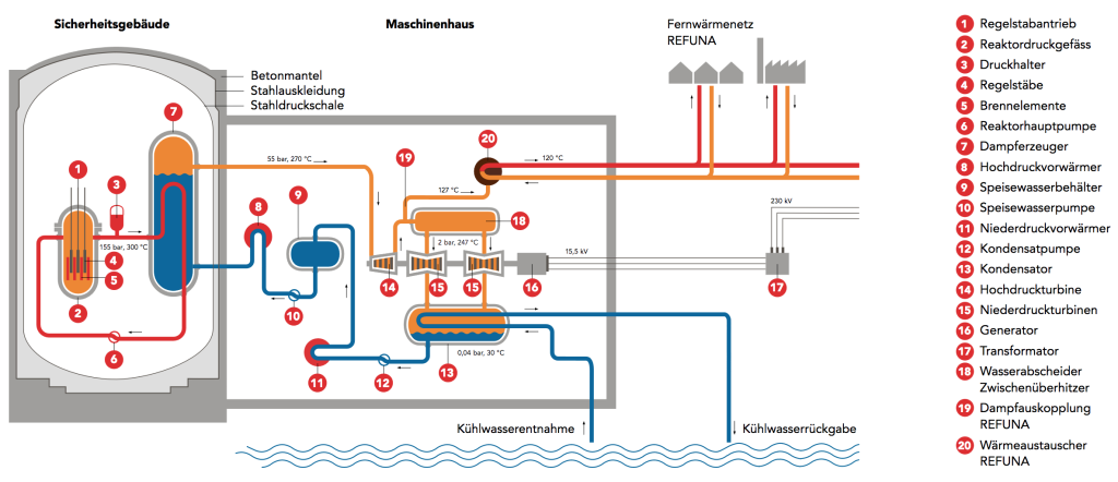 Die Grafik ist der Broschüre «Kernkraftwerk Beznau» des Energieunternehmens Axpo entnommen (siehe hier). Der Prozess der Wärmebereitstellung beginnt im Reaktordruckgefäss (2), das sich im Sicherheitsgebäude ganz links befindet. Dort wird das Kühlwasser, das aus der Aare kommt, durch die Wärme der Brennstäbe stark erhitzt. So gelangt das Kühlwasser in den Dampferzeuger (7), aus dem heisser Dampf ins Maschinenhaus rechts geleitet wird. Nach der Hochdruckturbine (14) wird ein Teil des Dampfes für die Fernwärme ausgekoppelt (19). Im Wärmetauscher (20) wird schliesslich das Heisswasser erzeugt, mit dem die bei Refuna versorgten Gebäude geheizt werden.