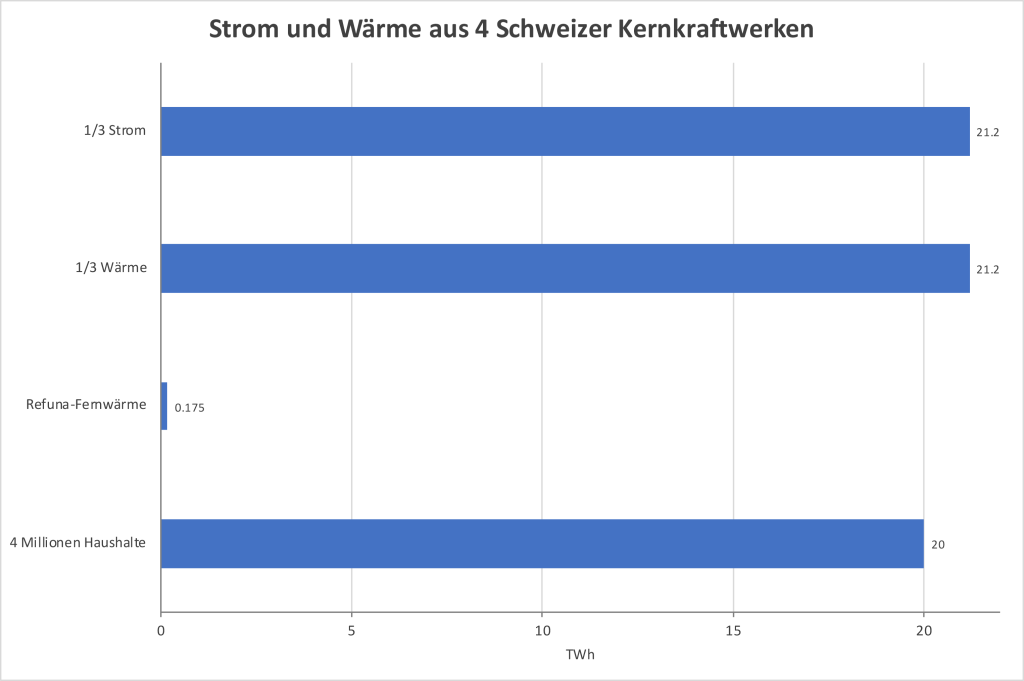 Laut Bundesamt für Statistik gibt es in der Schweiz rund vier Millionen Haushalte, mit einer durchschnittlichen Grösse von 2,18 Personen (siehe hier). Weil dies praktisch dem Standard-Haushalt aus dem Refuna-Bericht entspricht, können wir hochrechnen, wie gross die Wärmeproduktion sein müsste, um alle Schweizer Haushalte mit Wärme versorgen zu können: Insgesamt müssten 20 Millionen Megawattstunden dafür zur Verfügung stehen. Das sind, wie in der Grafik auf der untersten Zeile gezeigt, 20 Terawattstunden – also etwas weniger, als die 21,2 Terawattstunden aus unserern Kernkraftwerken. Die Abwärme der KKW würde also reichen, um alle Schweizer Haushalte zu heizen.