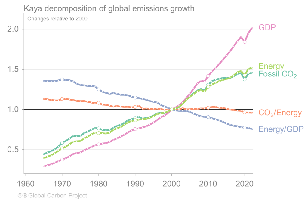 Diese Grafik zeigt die relativen Verhältnisse von fünf Parametern im Zeitraum von 1965 bis 2022. Alle Parameter zeigen globale Zahlen und sind auf das Stichjahr 2000 bezogen, wo sie den Indexpunkt 1,0 erhalten. Von oben nach unten sehen wir zuerst die Entwicklung des BIP (GDP, rosa), des Energieverbrauchs (Energy, hellgrün) und der fossilen CO2-Emissionen (blaugrün). Dabei fällt vor allem auf, wie ausserordentlich stark das BIP gewachsen ist, und wie sehr das Tempo dieses Wachstums seit 2000 sogar noch zugenommen hat.