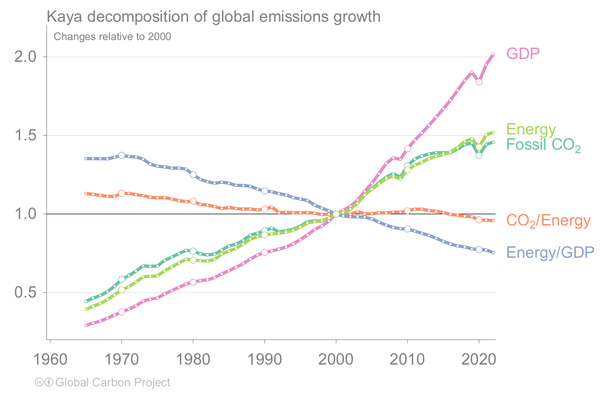 Demgegenüber steigen die Kurven für Energie und CO2 nur rund halb so stark, und sie liegen ausserdem sehr nahe beieinander. Die Verhältnisse zwischen den Kurven werden durch die zwei noch verbleibenden Parameter analysiert. Die Kohlenstoffintensität der Energieerzeugung CO2/Energy (orange) beschreibt das Verhältnis zwischen CO2-Erzeugung und Energie, und die Energieintensität der Wirtschaft Energy/GDP (blau) beschreibt das Verhältnis zwischen dem Energieverbrauch und dem BIP.