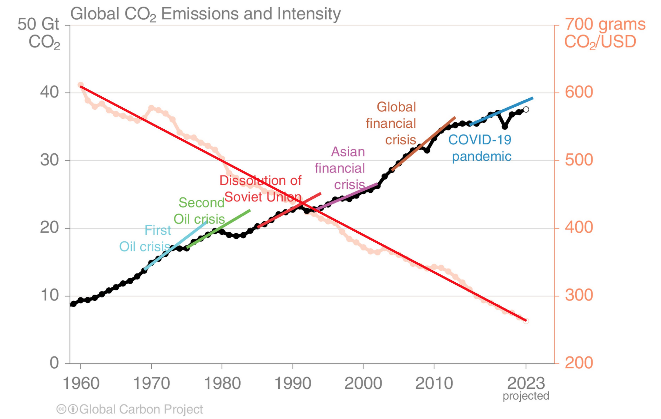 Die Autoren haben ausserdem für die wichtigsten Wirtschaftskrisen seit 1960 farbige Geraden eingezeichnet, die jeweils den Trend der Emissionen in den fünf Jahren vor der Krise für weitere fünf Jahre über die Krise hinaus projizieren. Dadurch wird deutlich, dass jedes Mal, wenn die schwarze Emissionskurve abflacht oder gar sinkt, eine grössere wirtschaftliche Krise als Auslöser gewirkt hat. Jedesmal aber hat sich die Wirtschaft danach mehr oder weniger rasch wieder erholt, was letztlich zum übergeordnet gleichmässigen Aufwärtstrend der CO2-Emissionen geführt hat.