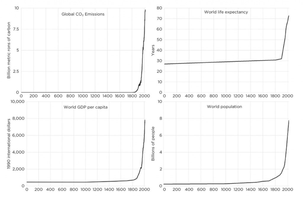Die folgende Grafik, die ich Epsteins Buch entnommen habe (Figur 4.1), zeigt die zeitliche Korrelation der drei Wohlstandsindikatoren Lebenserwartung, Einkommen pro Kopf und Bevölkerungsentwicklung mit den steigenden CO2-Emissionen für die letzten 2000 Jahre im globalen Massstab. Epstein gibt dieser Grafik den Titel «The Hydrocarbons and Human Flourishing Hockey Sticks», also etwa «Die Hockeyschlägerkurven der Fossilen und des menschlichen Wohlstands».