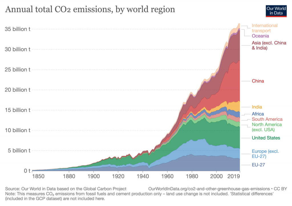 Vor allem aber stellt sich die Frage nach den Ursachen der hier gezeigten Erwärmung. Der Weltklimarat IPCC lässt eigentlich keinen Zweifel mehr zu an der These, dass die Erderwärmung zu hundert Prozent menschengemacht ist. Menschengemacht aber bedeutet durch CO2-Emissionen verursacht. Die Entwicklung dieser Emissionen seit 1900 zeigt aber einen mehr oder weniger konstanten Anstieg, dessen Tempo seit 1950 deutlich zugelegt und sich erst in den letzten zehn Jahren wieder leicht verlangsamt hat.