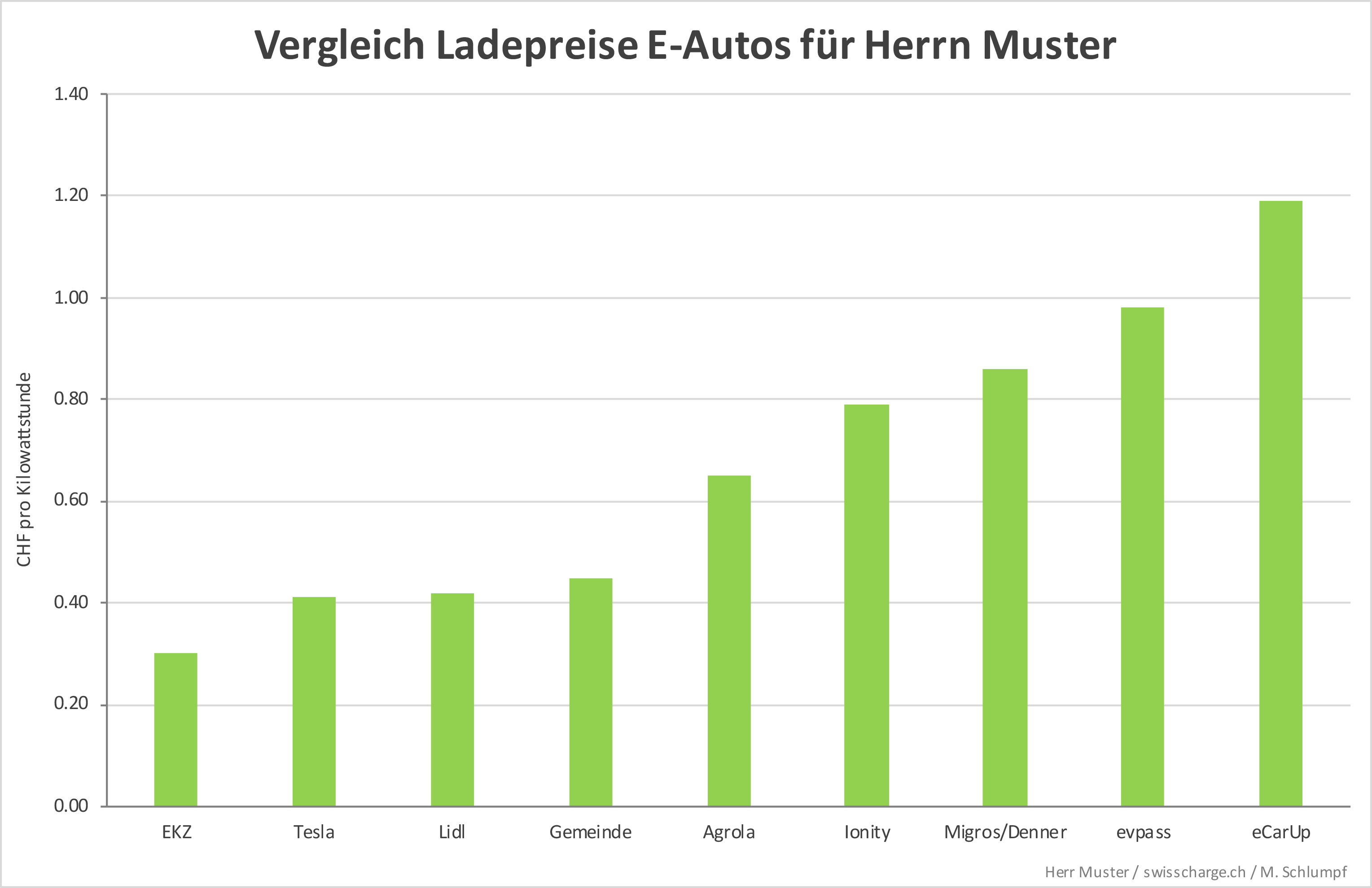 Die Grafik zeigt die Preise in Franken pro Kilowattstunde. Als Referenzpreis ist ganz links der private EKZ-Tarif von 30 Rappen angegeben. Rechts davon sind die öffentlichen Angebote in Herrn Musters Umgebung aufsteigend vom Tesla-Supercharger mit 0.41 bis zum eCarUp-Anschluss mit 1.19 Franken aufgelistet. Eine solche extreme Spannbreite von eins zu drei ist bei Benzin- und Dieselpreisen völlig undenkbar.