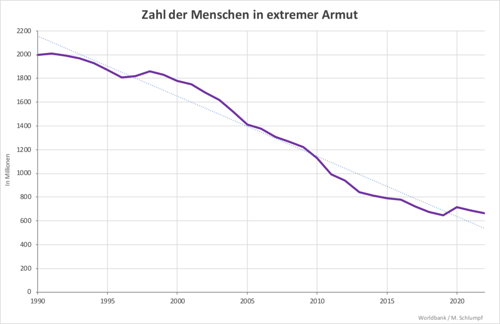 Die Antwort ist einfach: Oxfam berücksichtigt ausschliesslich die Entwicklung seit 2020. Sie leitet also alles von einem sehr kurzen Abschnitt ab, in dem ausgerechnet der grösste kurzzeitige Rückschlag bei der Armutsbekämpfung seit 1990 stattgefunden hat. Verwendet man nur den Trend, der sich aus diesem Abschnitt ableiten lässt, erhält man tatsächlich das alarmierende Resultat, das sich Oxfam offenbar herbeigewünscht hat. Es ist aber kein Wunder, dass die Organisation so handelt, denn sie ist ja auf Spenden zur Armutsbekämpfung angewiesen.