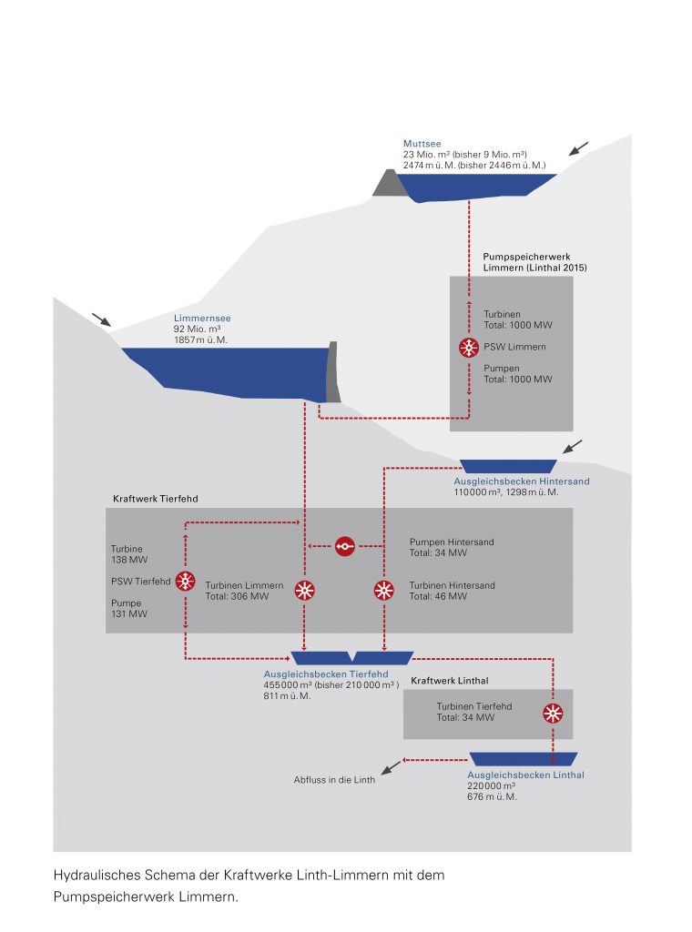 Das Pumpspeicherwerk Limmern wurde 2016/17 vom Energiekonzern Axpo nach gut siebenjähriger Bauzeit in Betrieb genommen. Es erweitert die schon bestehenden Anlagen der Kraftwerke Linth-Limmern AG, die sich im Gebirge oberhalb Linthal, Ochsenstafel befinden. Die folgende Skizze aus einem Faktenblatt der Axpo (siehe hier) zeigt die Funktionsweise aller Seen und Kraftwerke dieses imposanten Wasserkraftsystems.