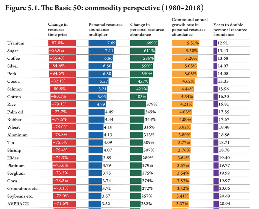 Vom Zeitpreis ausgehend haben die Autoren von «Superabundance» eine klare Analytik für die Beschreibung des «Ressourcenüberschusses pro Person» (personal resource abundance) entwickelt. Auf diese Weise haben sie sieben unterschiedliche Warenkörbe mit verschiedenen Zeithorizonten untersucht. Die folgende Grafik zeigt diese Analytik anhand des ersten von ihnen untersuchten Warenkorbes «The Basic 50». Dieser ist zusammengesetzt aus 50 Rohstoffen (Kupfer, Nickel, Silber etc), Agrarprodukten (Bananen, Weizen, Geflügel etc) und Primärenergieträgern (Kohle, Erdgas, Uran etc). Das untersuchte Zeitfenster reicht von 1980 bis 2018.