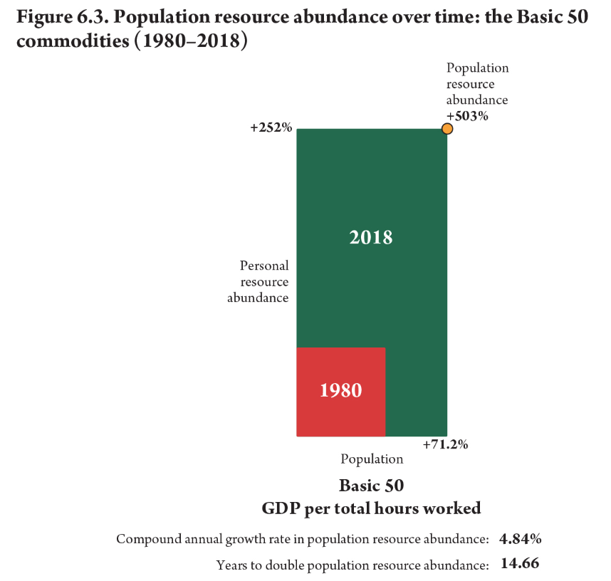 Oder anders dargestellt: Während auf der Ressourcenebene pro Kopf (vertikale Achse) 2018 3,52 mal mehr gekauft werden konnte als 1980 (100 plus 252 Prozent), war das auf der Ebene der Gesamtbevölkerung 6,03 mal mehr (Gesamtfläche). Und genau diese zusätzliche Steigerung der Überschüsse, die durch den Einbezug des Bevölkerungswachstums in die Rechnung entsteht, ist mit dem Titel des Buches «Superabundance» gemeint.