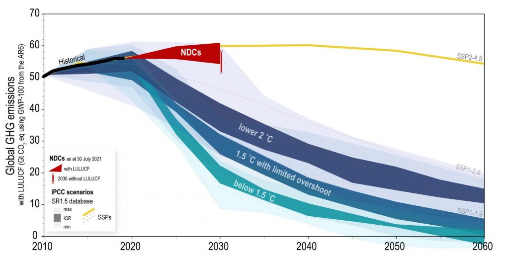 Die aktuellsten länderspezifischen Pläne (Nationally Determined Contributions, NDC), die bis zum 30. Juli 2021 eingereicht wurden, beschreiben alle klimarelevanten Massnahmen, die jedes einzelne Land bis ins Jahr 2030 umsetzen will. Zählt man die Auswirkungen all dieser Pläne auf die Treibhausgas-Emissionen zusammen, so ergibt sich der dunkelrote Kurvenverlauf in der Grafik (NDCs): Im Schnitt steigen die Emissionen bis 2030 um 16 Prozent. Und dies wohlverstanden aber nur, wenn all diese Pläne auch tatsächlich umgesetzt werden. Verfehlen einige Länder ihr Versprechungen, würde die Kurve noch mehr steigen.