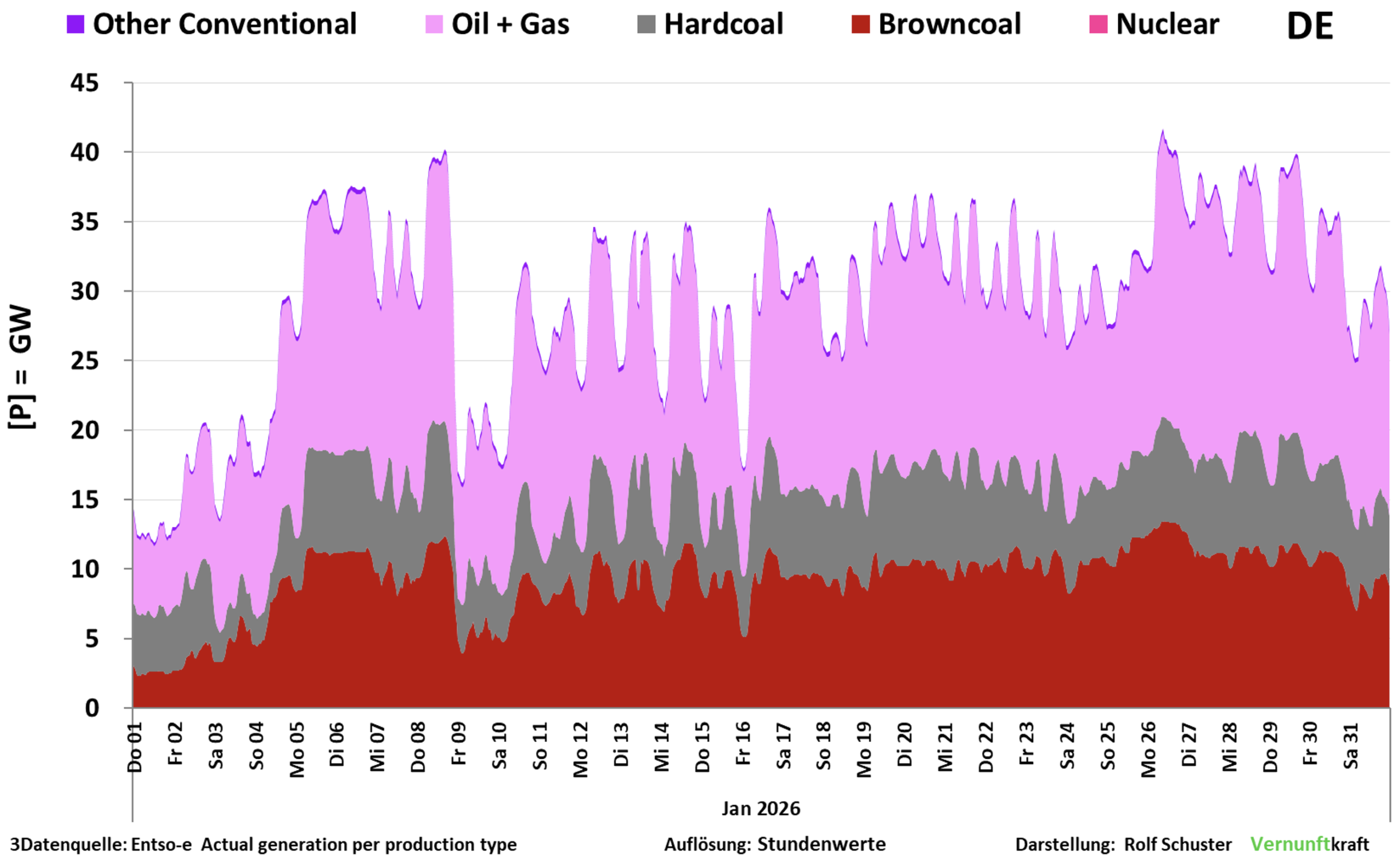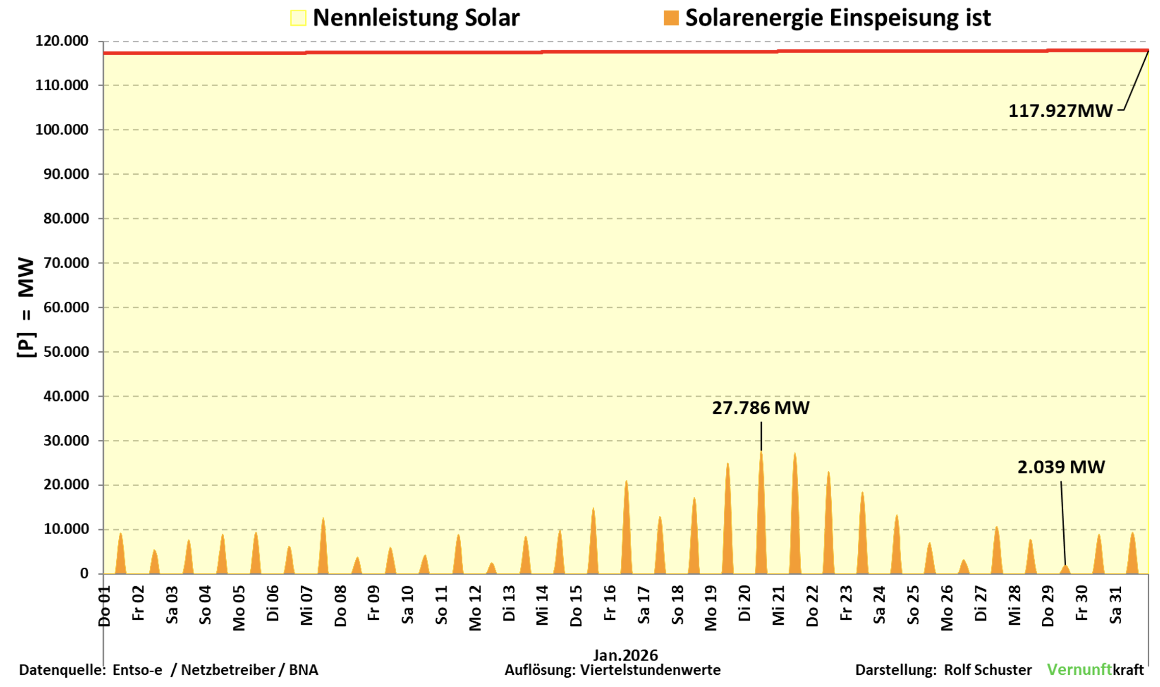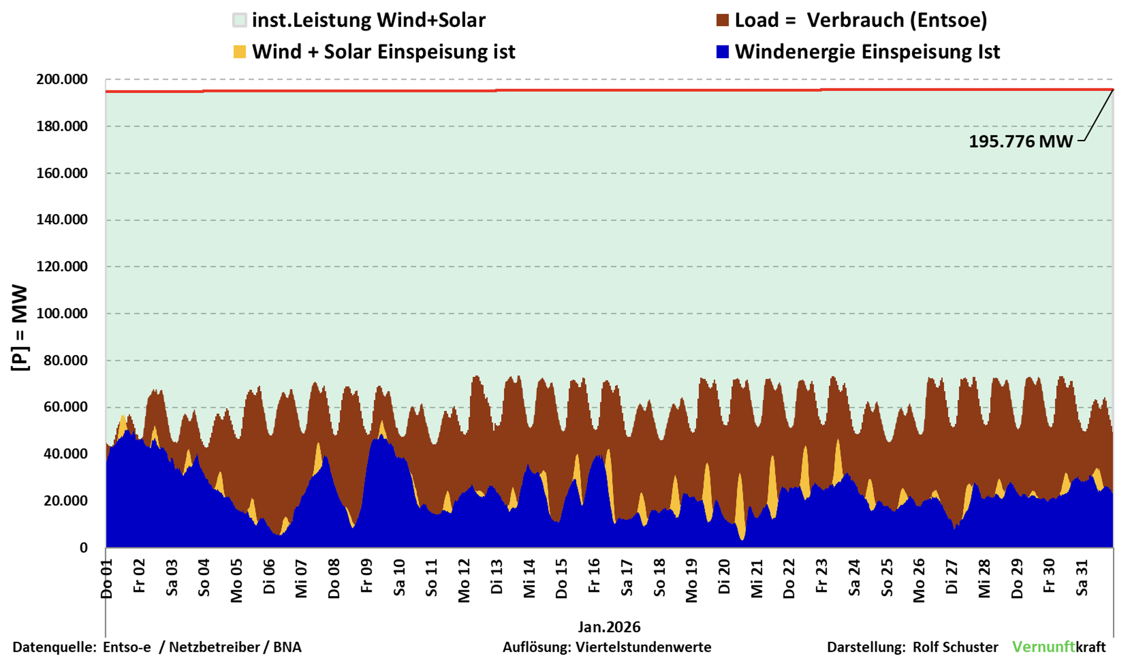 Eine ausgezeichnete Zusammenstellung der wichtigsten Stromkennzahlen Deutschlands findet man bei Rolf Schuster von vernunftkraft.de (siehe hier). Schuster gelingt es, mit anschaulichen Leistungs-Zeit-Grafiken die Stromeinspeisung der neuen Erneuerbaren anschaulich darzustellen. Die neuesten Zahlen beschreiben die Stromsituation in Deutschland im Januar 2026:
