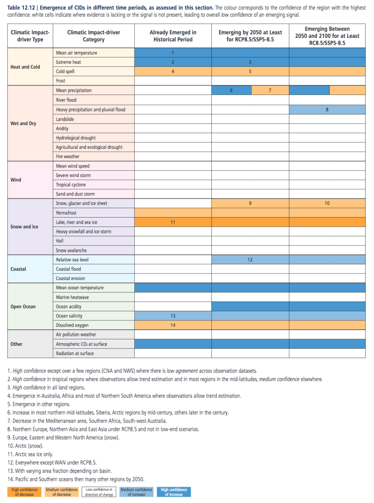 Gegen Schluss des Kapitels 12 werden Abschätzungen über die Wahrscheinlichkeit bestimmter Klimagefahren im globalen Kontext diskutiert. Das ist für die Klimadiskussion entscheidend, weil sich die Treibhausgase in der Atmosphäre ja um den ganzen Erdball gleichmässig verteilen. Für jede einzelne der 33 Klimatreiber-Kategorien wird der aktuelle Stand des Wissens zusammengefasst, und zwar für drei verschiedene «Zeitpunkte des Eintretens»: Erstens, was ist bisher geschehen, zweitens, was ist bis 2050 zu erwarten, und drittens, was wird sich zwischen 2050 und 2100 ereignen. Schliesslich werden alle Resultate in dieser Tabelle zusammengefasst: