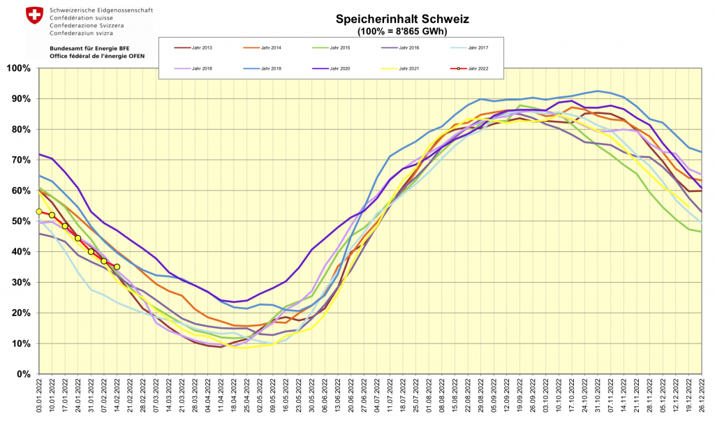 Die hellblaue Kurve für 2017 beginnt am Jahresanfang bei 50 Prozent, bereits vergleichsweise tief. Eine längere Frostperiode kombiniert mit eingeschränkter Erzeugung aus Kernkraftwerken hat im Januar zu einer extremen Beanspruchung der Speicherkraftwerke geführt, wodurch die Füllstandskurve bis Anfang Februar auf Rekordtiefstände gefallen ist. Das wiederum hatte zur Folge, dass im Februar der Ertrag aus den Wasserkraftwerken so tief war, wie nie zuvor (was in der ersten Grafik sichtbar ist). «Gerettet» wurden wir damals nur durch maximal hohe Importe aus Deutschland und Frankreich.
