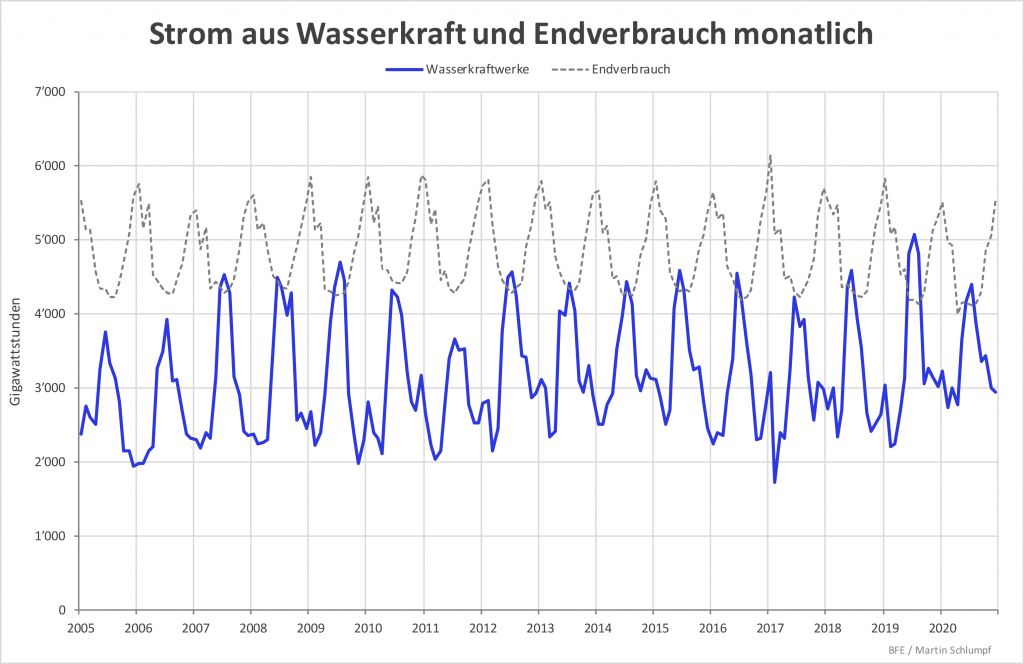 Die Erzeugung aus Wasserkraft ist konträr zum Verbrauch