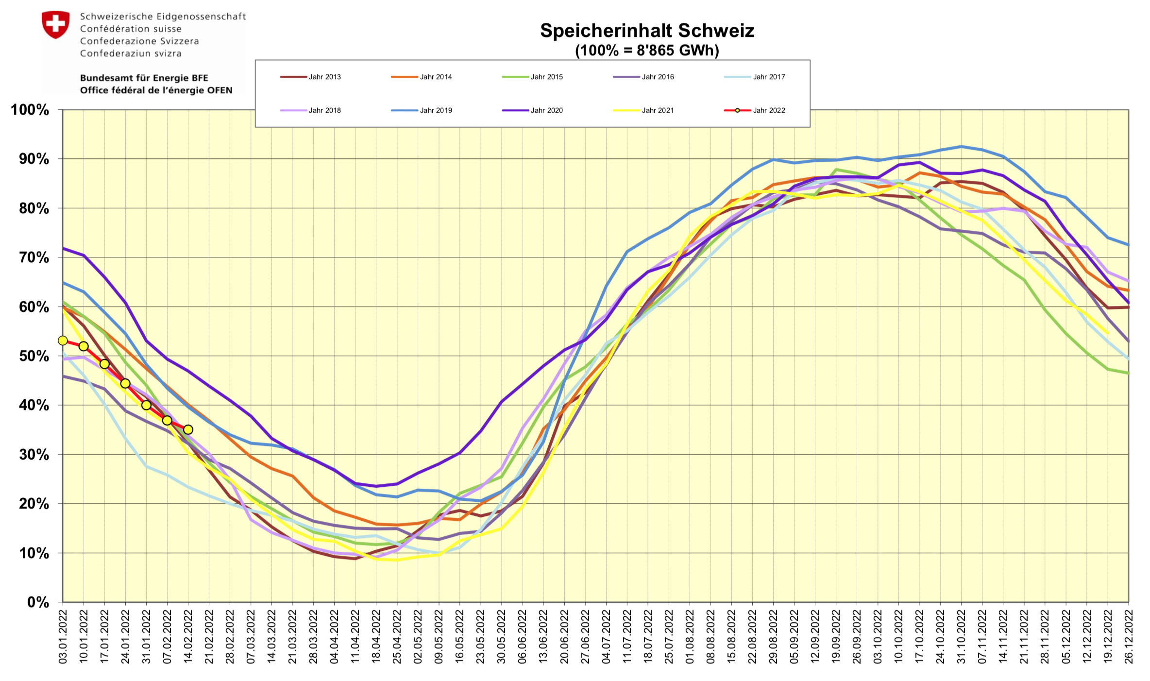 Die hellblaue Kurve für 2017 beginnt am Jahresanfang bei 50 Prozent, bereits vergleichsweise tief. Eine längere Frostperiode kombiniert mit eingeschränkter Erzeugung aus Kernkraftwerken hat im Januar zu einer extremen Beanspruchung der Speicherkraftwerke geführt, wodurch die Füllstandskurve bis Anfang Februar auf Rekordtiefstände gefallen ist. Das wiederum hatte zur Folge, dass im Februar der Ertrag aus den Wasserkraftwerken so tief war, wie nie zuvor (was in der ersten Grafik sichtbar ist). «Gerettet» wurden wir damals nur durch maximal hohe Importe aus Deutschland und Frankreich.